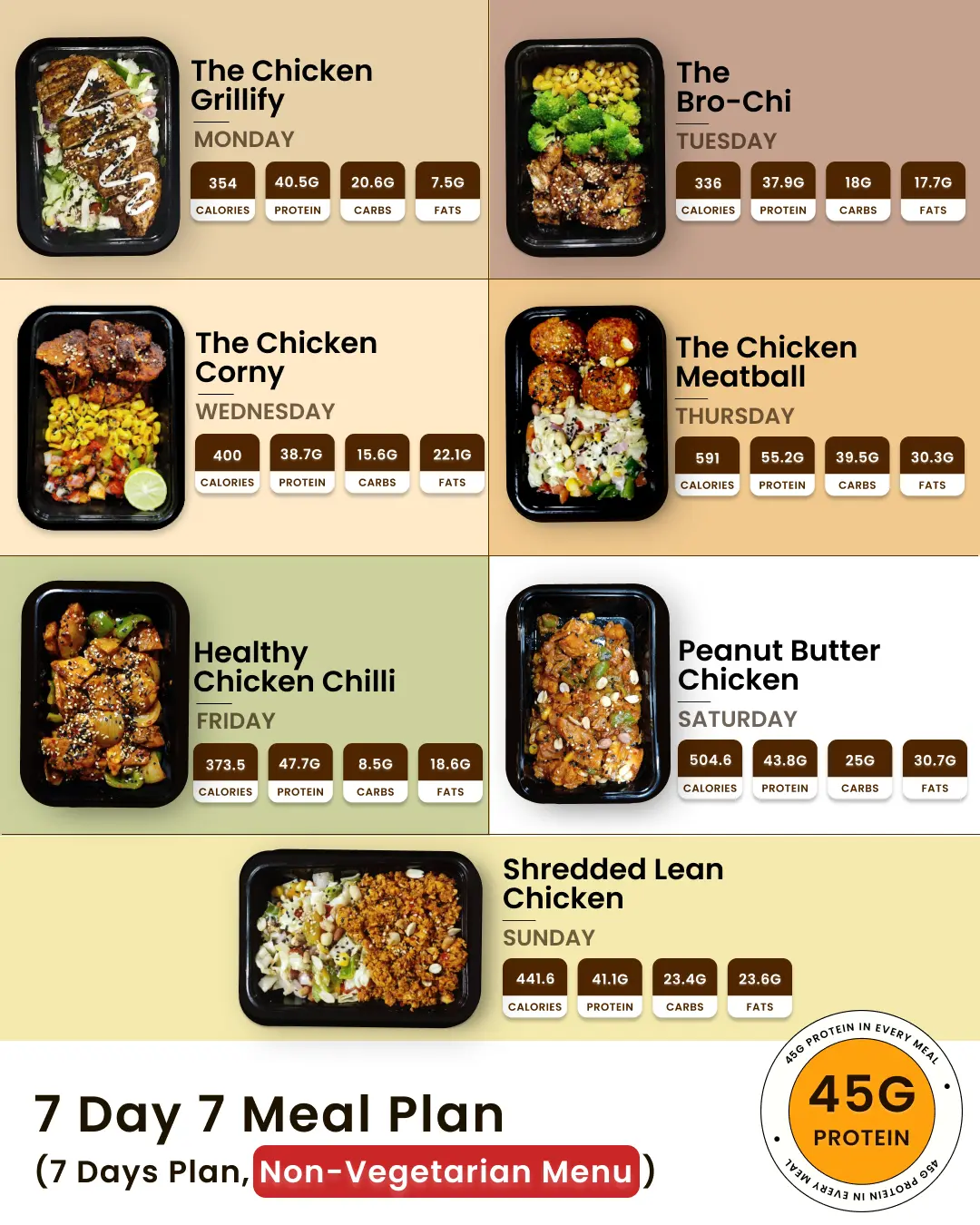 Get 1 meal every day for 7 days. (7 different types of meals). There are 7 different types of meals In this plan, which will be rotated throughout the week. Swipe to check the meals included in this plan. (calories of all the meals are mentioned in the picture). Check out the timetable of this plan . (Swipe to check)