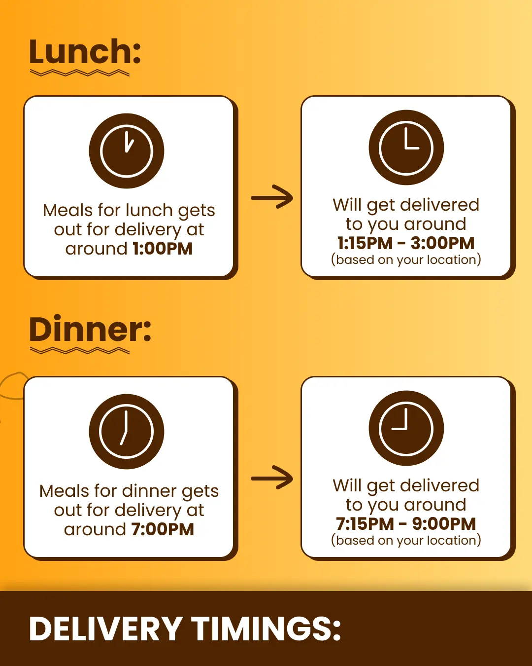 • The meals for lunch gets out for delivery at around 1:00 PM, you will get your meal delivered to your doorstep anywhere between 1:30 PM to 3:00 PM.
